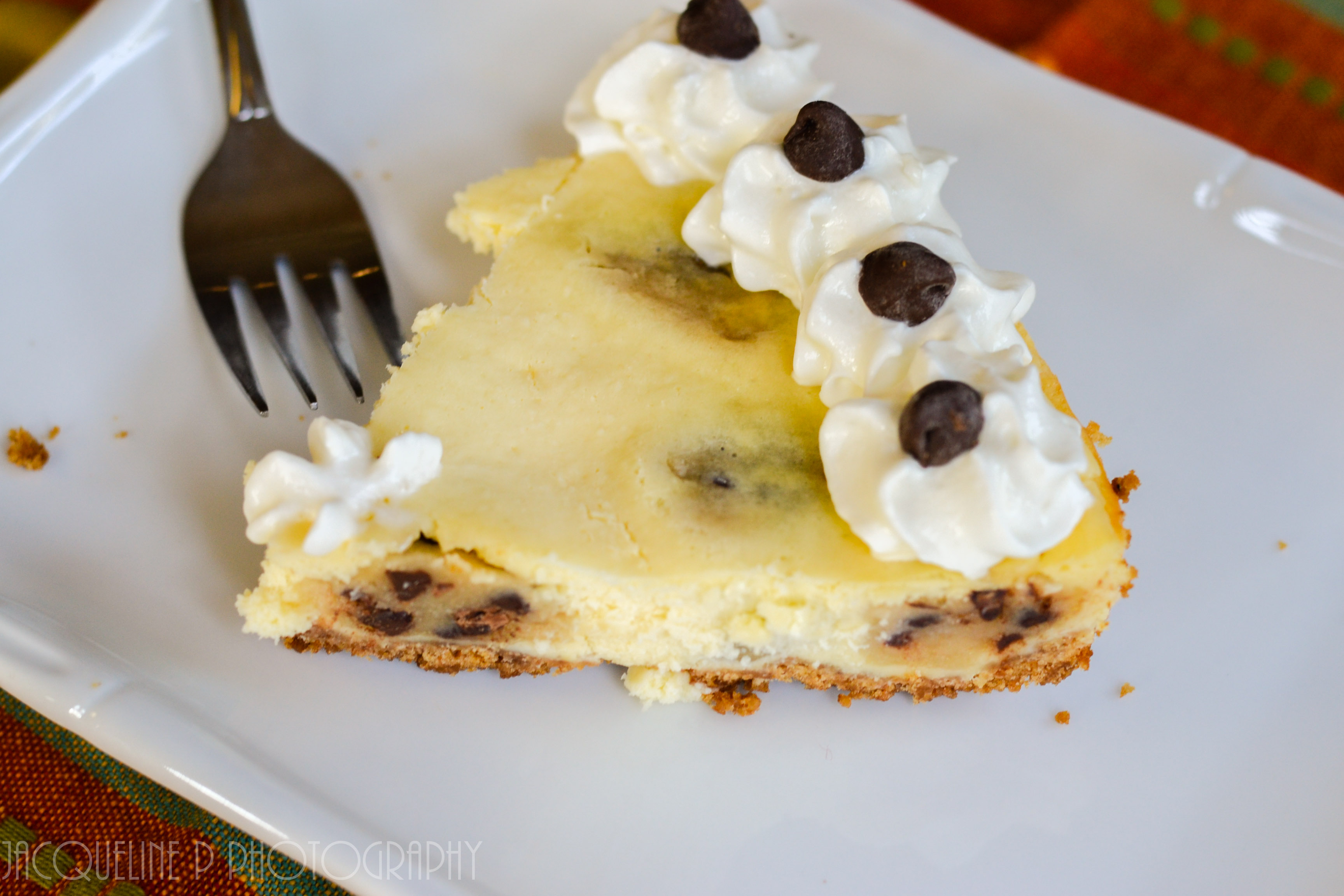 - Pour half the batter into the prepared crust. Gently stir in the cookie dough balls and the additional 1 cup mini chocolate chips into the remaining batter. Pour into the pan, spreading the batter to the sides of the pan and evening it out across the top (it is ok to see bumps of cookie dough here and there, smooth it the best you can). Bake the cheesecake at 325 degrees for one hour. Turn off the oven and prop the door open several inches. Let the cake sit in the oven for an additional 30 minutes. Remove the cake from the oven and let it cool completely on a wire rack. Refrigerate until chilled (ideally, overnight). To serve, cut into slices and top with whipped cream and mini chocolate chips.