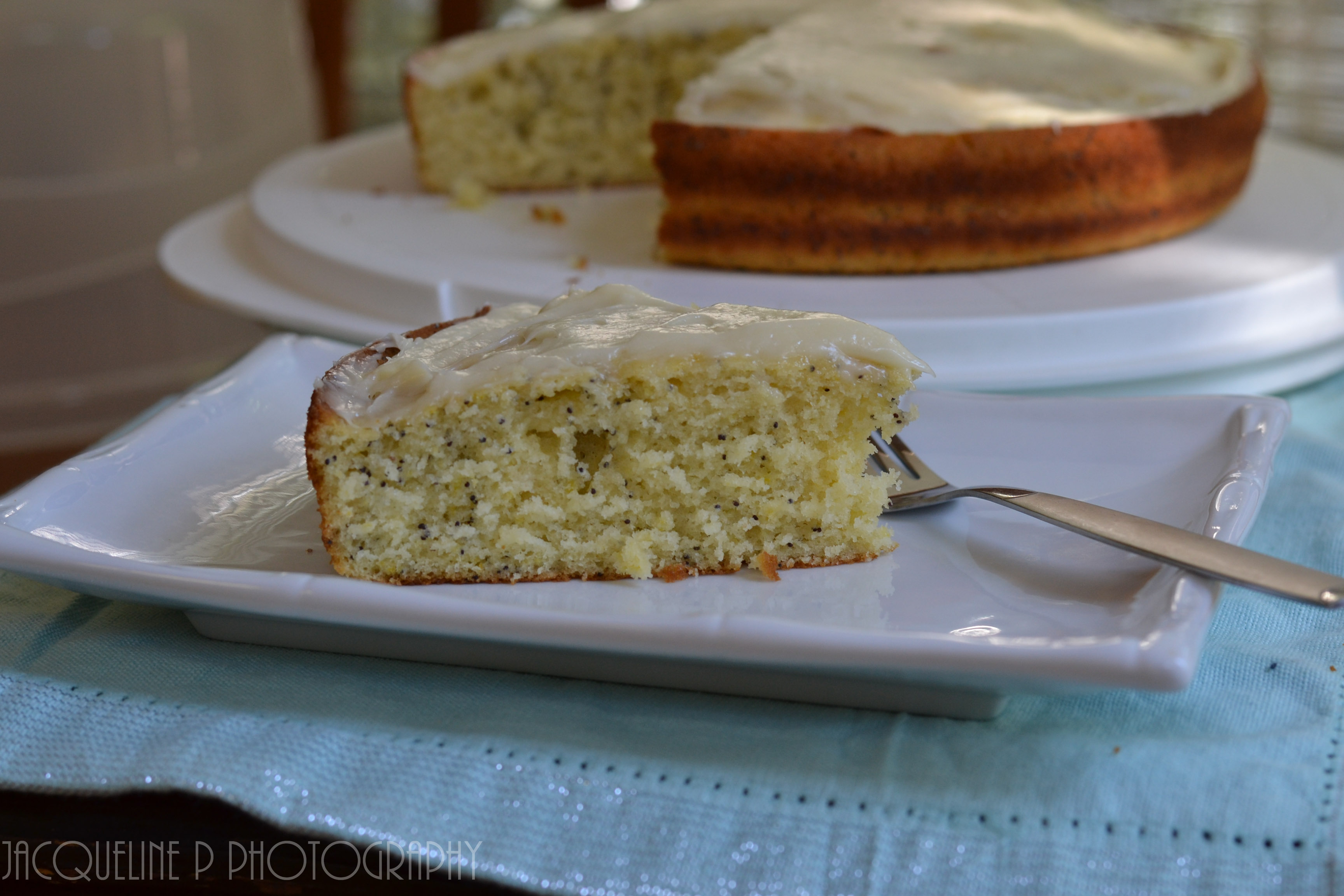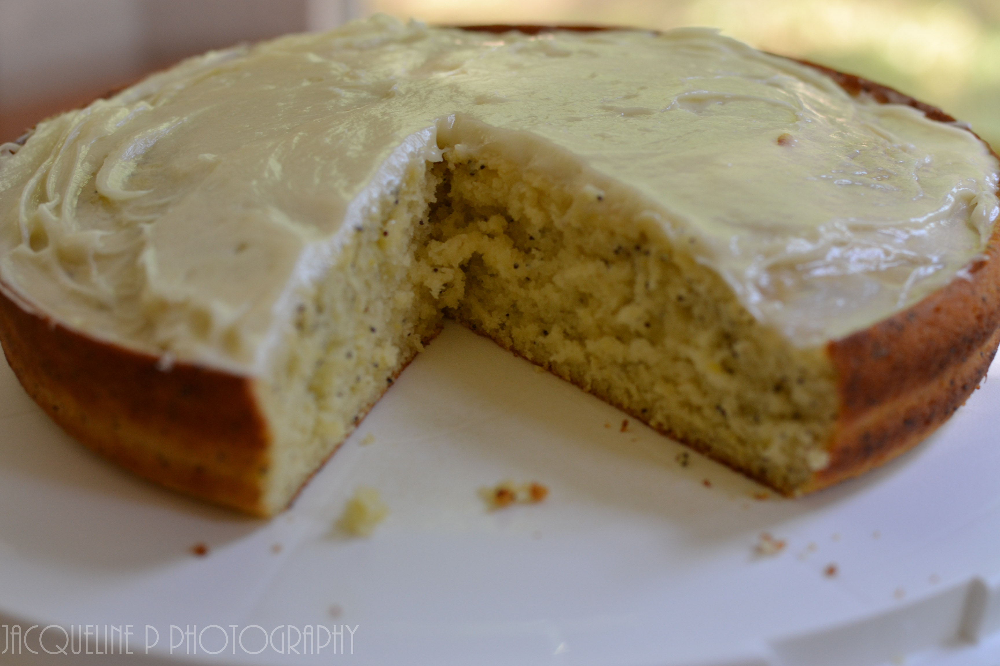 5. Alternate stirring in wet and dry ingredients until everything is added into the cake batter. Gently stir in the poppy seeds and melted butter. Pour into cake pan and bake 45-55 minutes or until baked thoroughly and toothpick comes out clean after being inserted. Cool cake 15 minutes.