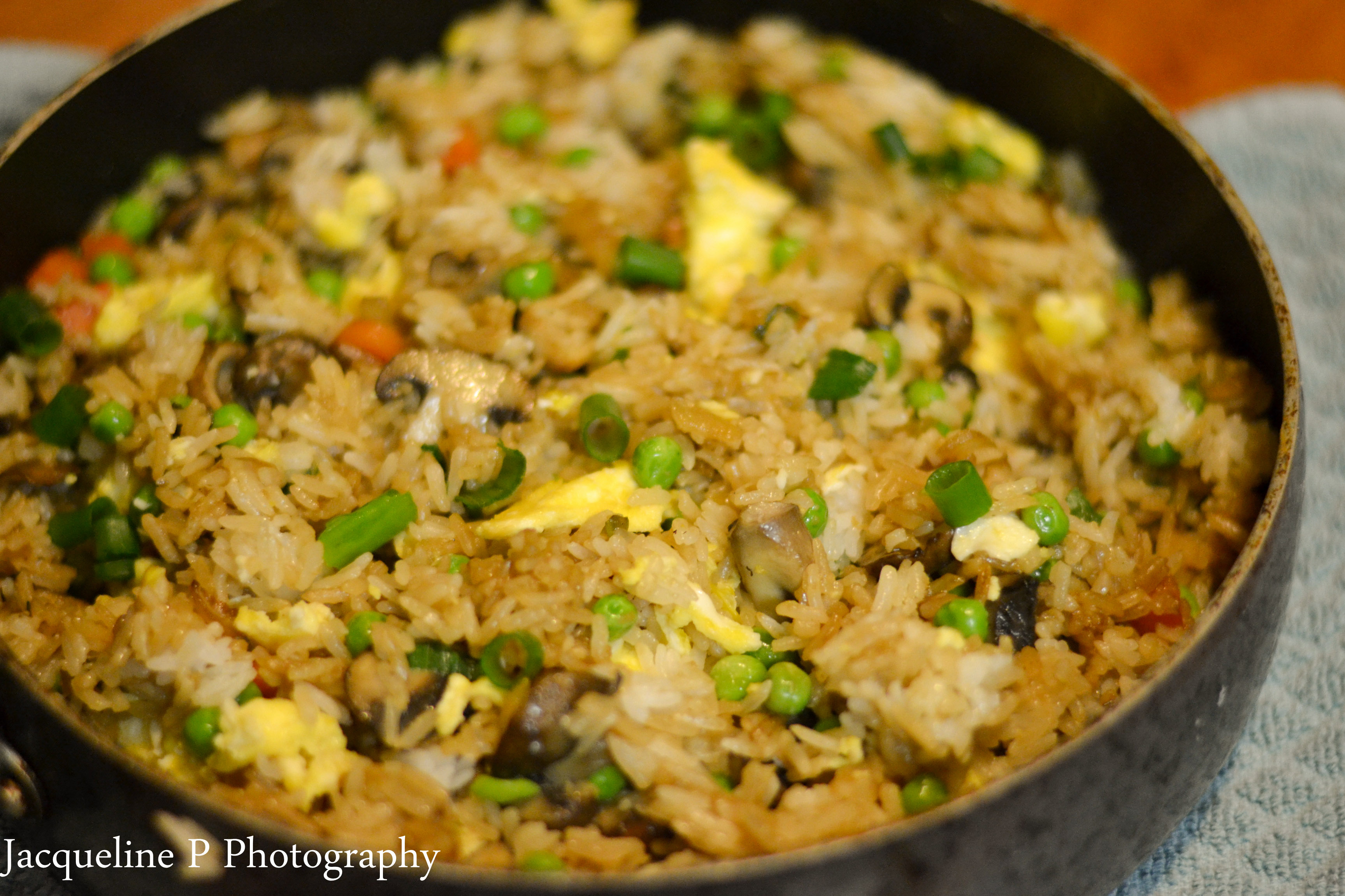1.Heat canola oil in a wok or large pan. Add onion, green onion and carrots cook about 3/4 minutes until softened. Add mushrooms and cook another 2-3 minutes. Add Garlic and ginger for and stir about 30 seconds then add soy sauce and pepper along with rice and peas. Mix well to combine.