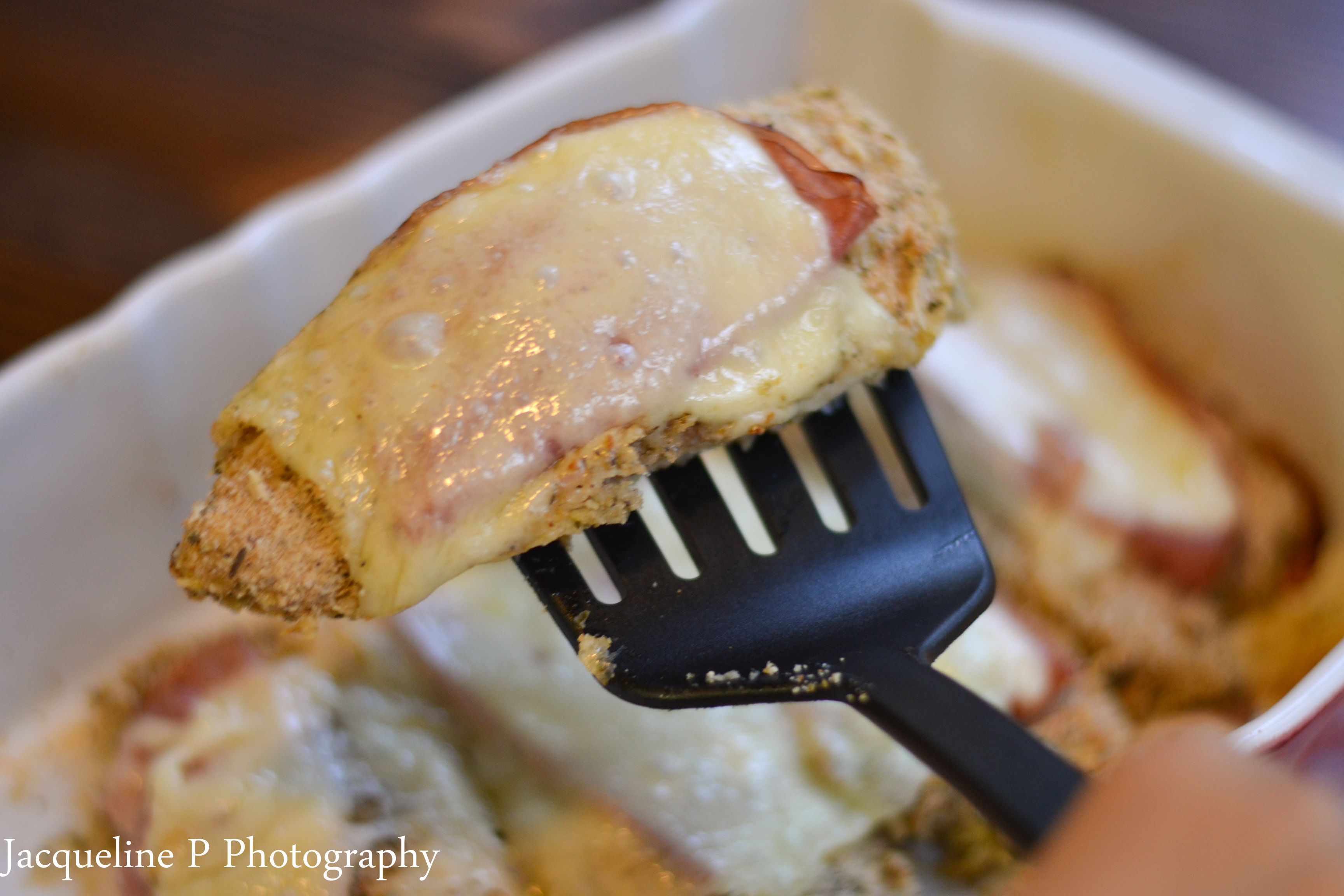 - Dip chicken in egg then breadcrumbs. Lay flat in baking dish and bake about 30 minutes. Once chicken is cooked lay the ham and top with swiss cheese. Continue baking for 5 minutes until cheese is bubbly.